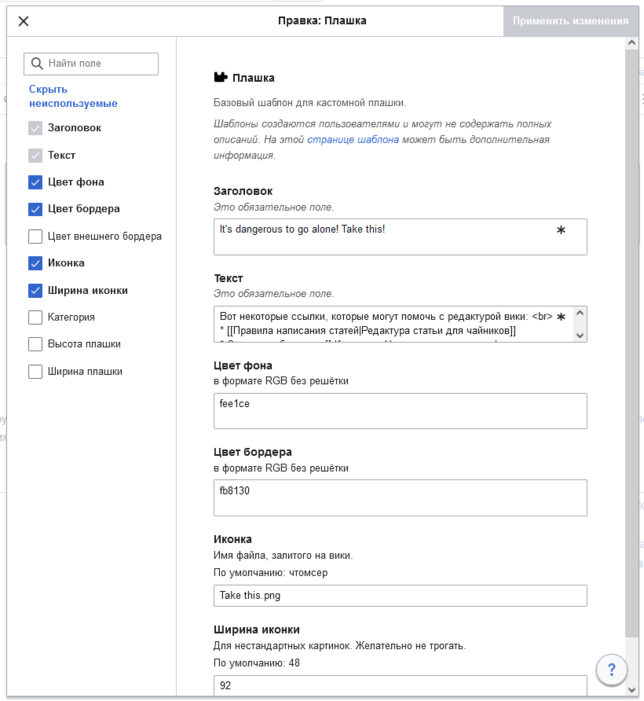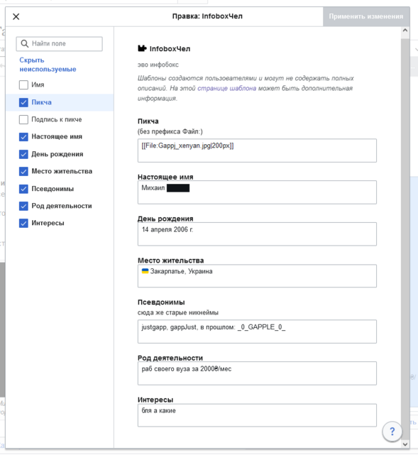Чтобы не ебаться с этим, есть готовые шаблоны инфобоксов с уже обозначенными полями. У нас это пока только инфобокс для каких-либо персон – {{InfoboxЧел}}. Его легко можно редачить прямо в граф. редакторе: