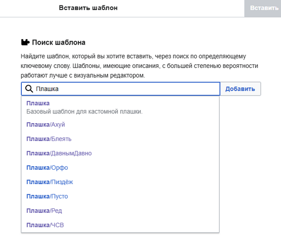 | {{Плашка/Пиздёж}} | Проставляется на статьях, в которых слишком много пиздежа. | Осторожно! Ложь, пиздёж и провокация! Чтомсер считает, что автор статьи совсем немного (хотя скорее всего дохуя много) напиздел, и советует воспринимать всё, что тут написано, с долей скептицизма. | ||